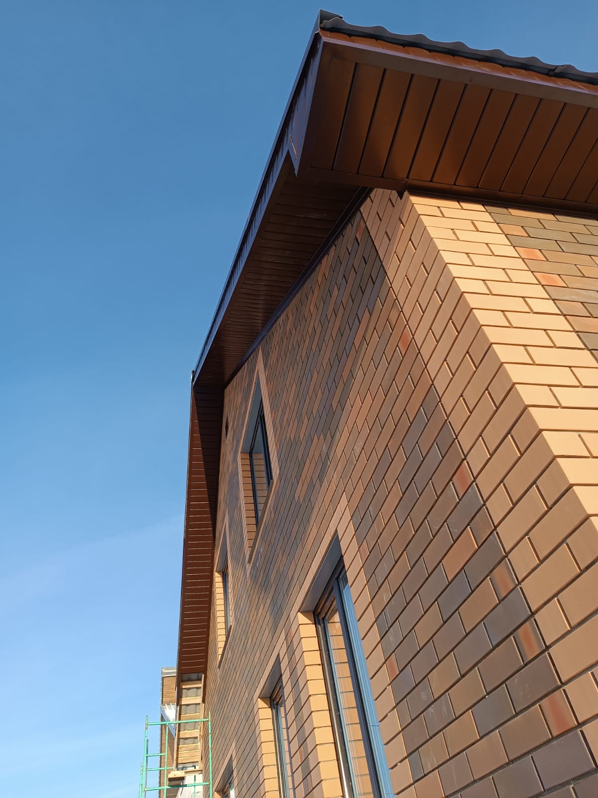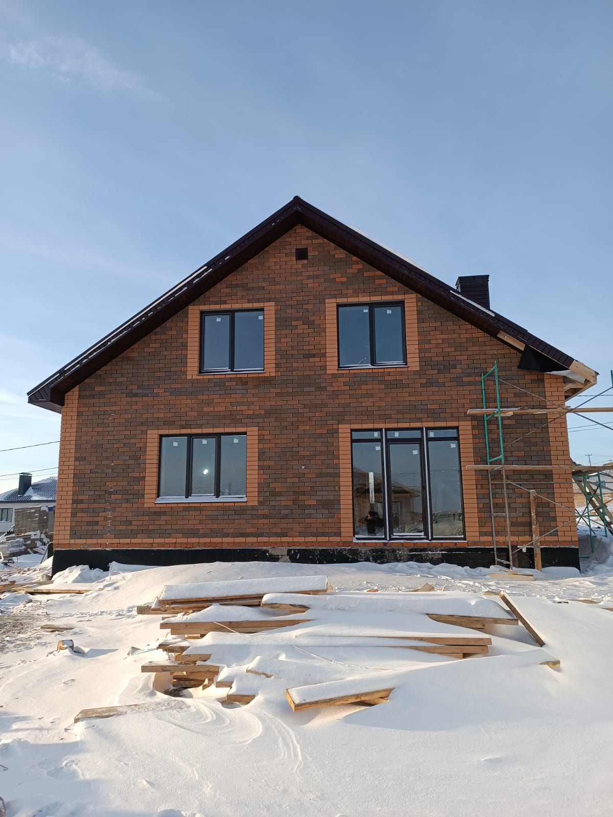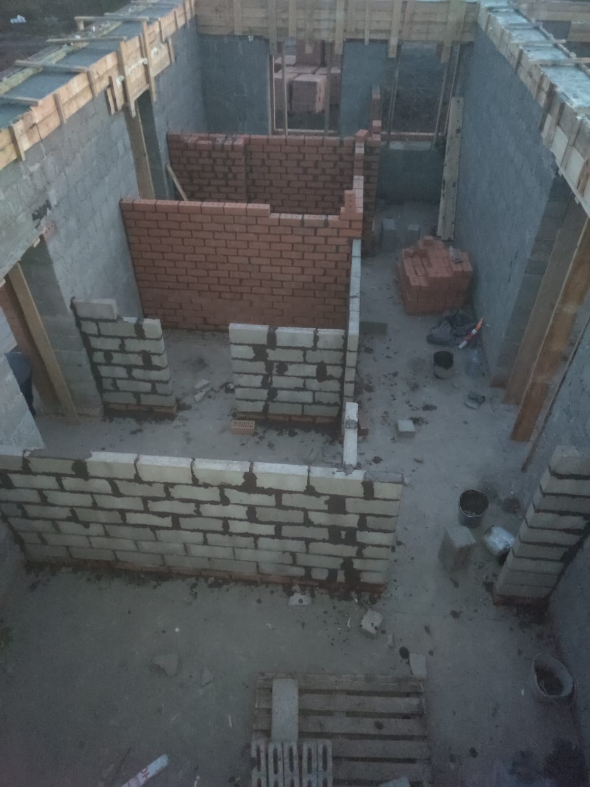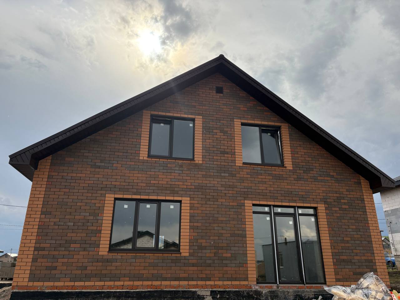 Перегородки комнат 90 мм., на данном объекте заложили свайно-роствековый фундамент, выполнили разводку систем канализаций и водоснабжения, залили монолитную плиту, возвели стены с наружным слоем из облицовочного кирпича утепление толщиной 100 мм. между основной стеной и облицовкой. Выполнили заливку армопояса, следующим этапом укладка плит перекрытия. Кровельная система Металлочерепица , подшивка карнизов и свесов в кровле, установили окна с наружной ламинацией под цвет кровли.