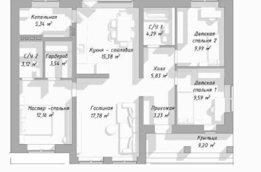 В вариантах указана стоимость строительства дома из разного материала. Цены указаны за строительство дома в ипотеку, при заказе строительства дома за наличный расчет предоставляется скидка 10%. . Комендант 5,34 м², Гардероб 3,12 м², Кухня-спальня 15,38 м², С/У 1 6,29 м², Детская спальня 2 9,99 м², Хом 5,83 м², Детская спальня 1 9,59 м², Мастер-спальня 12,16 м², Гостиная 17,78 м², Пушкачок 3,23 м², Крыша 9,20 м²