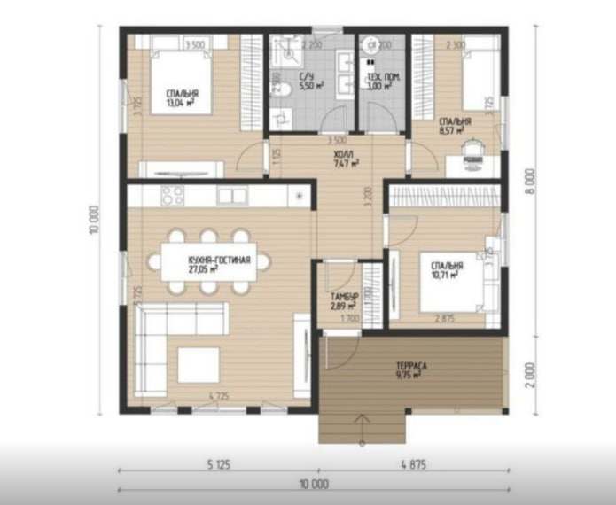 В вариантах указана стоимость строительства дома из разного материала. Цены указаны за строительство дома в ипотеку, при заказе строительства дома за наличный расчет предоставляется скидка 10%. Спальня 13,04 м², Кухня-гостиная 27,05 м², Тамбур 2,89 м², Терраса 9,75 м², Спальня 8,57 м², Спальня 10,71 м², Терраса 9,75 м². Общая отапливаемая площадь: 62,26 м², общая с террасами: 81,76 м², ориентировочная площадь по внешним размерам: 100 м².