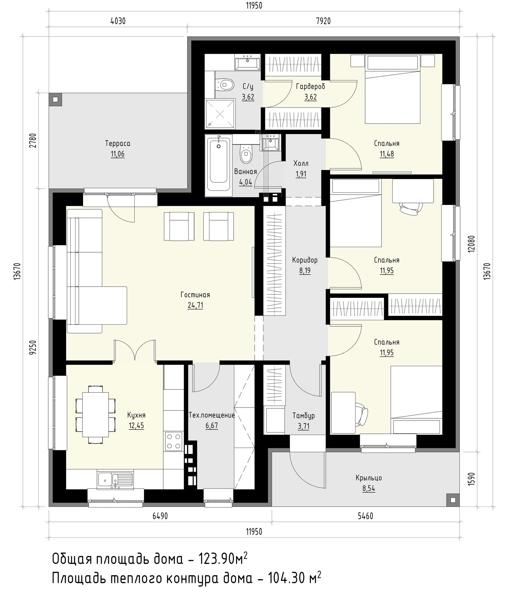 В вариантах указана стоимость строительства дома из разного материала. Цены указаны за строительство дома в ипотеку, при заказе строительства дома за наличный расчет предоставляется скидка 10%. Гардероб 3,62 м², с/у 3,62 м², спальня 11,48 м², холл, ванная 4,04 м², коридор 8,19 м², спальня 11,95 м², спальня 11,95 м², кухня 12,45 м², техническое помещение 6,67 м², тамбур 3,71 м², крыльцо 8,54 м², крыльцо 8,54 м², крыльцо, общая площадь дома 123,90 м²