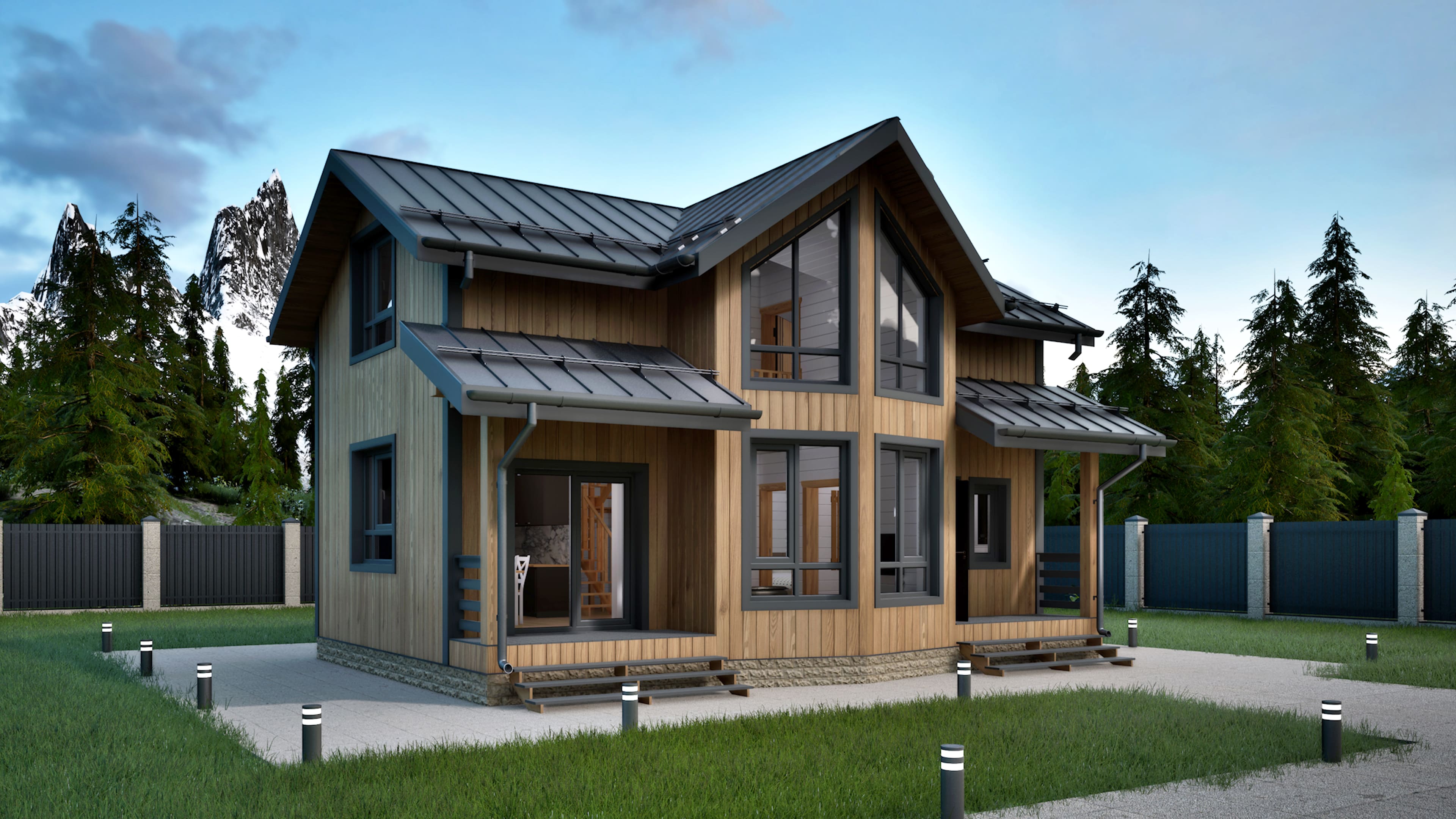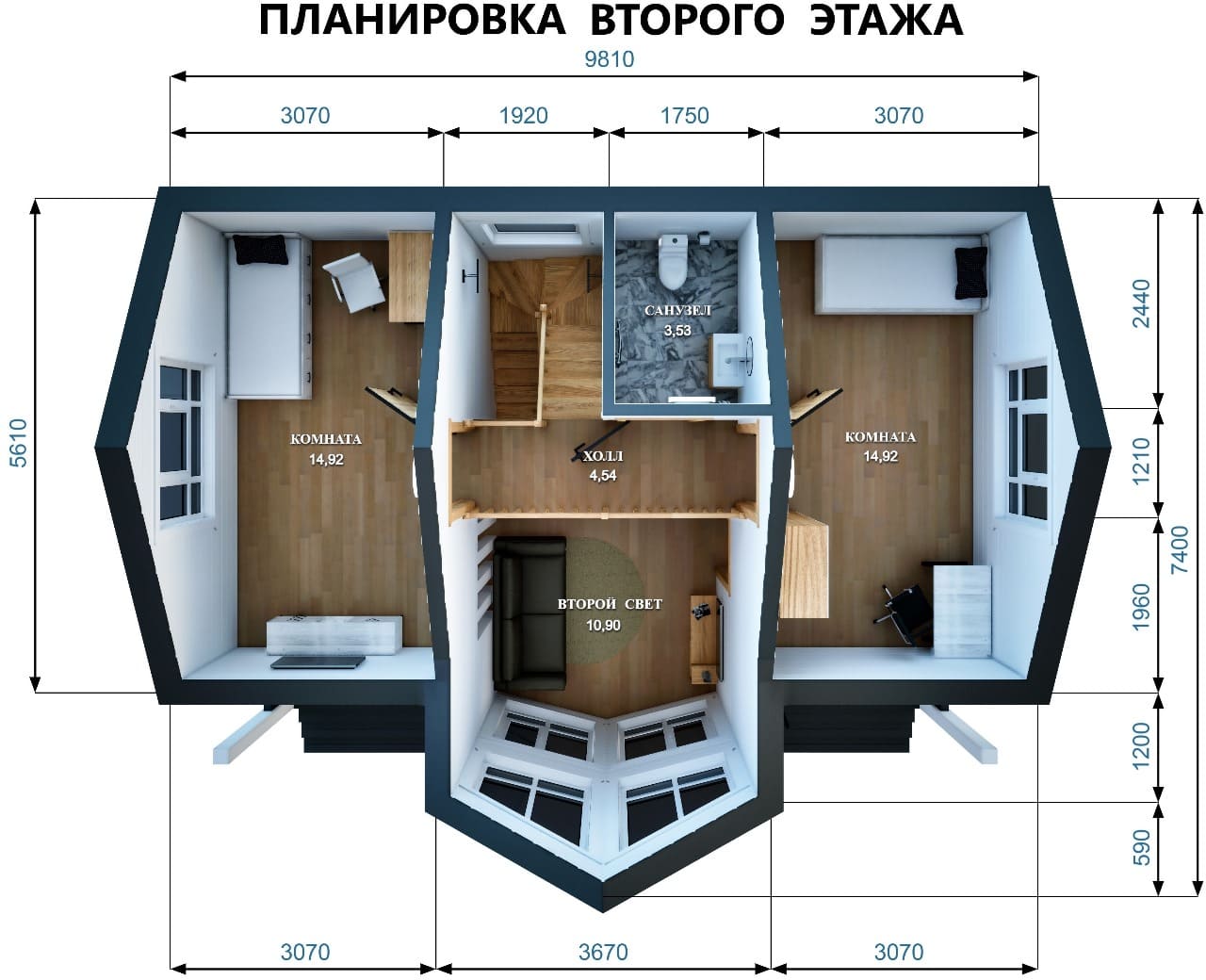 Второй этаж: две спальни и ванная комната формируют комфортное личное пространство. Особое впечатление создаёт открытая зона второго света, визуально увеличивающая объём дома и придающая интерьеру лёгкость