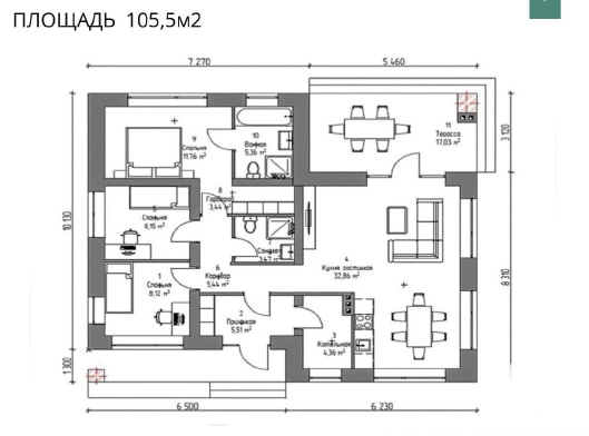 В вариантах указана стоимость строительства дома из разного материала. Цены указаны за строительство дома в ипотеку, при заказе строительства дома за наличный расчет предоставляется скидка 10%. На плане этажа общей площадью 105,5 м² представлены следующие помещения: терраса — 17,03 м², кухня — 32,86 м², столовая — 8,12 м², коридор — 4,36 м², ванная — 5,34 м², стоянка — 17,76 м², а также несколько спальных зон: кровать 3,51 м², кровати 5,44 м², кровати 3,51 м² . «Столовая» (8,15 м² и 6,00 м², «Салон» «Служебный» и элементы мебели. Планировка включает входную группу, зону отдыха и хозяйственные помещения.