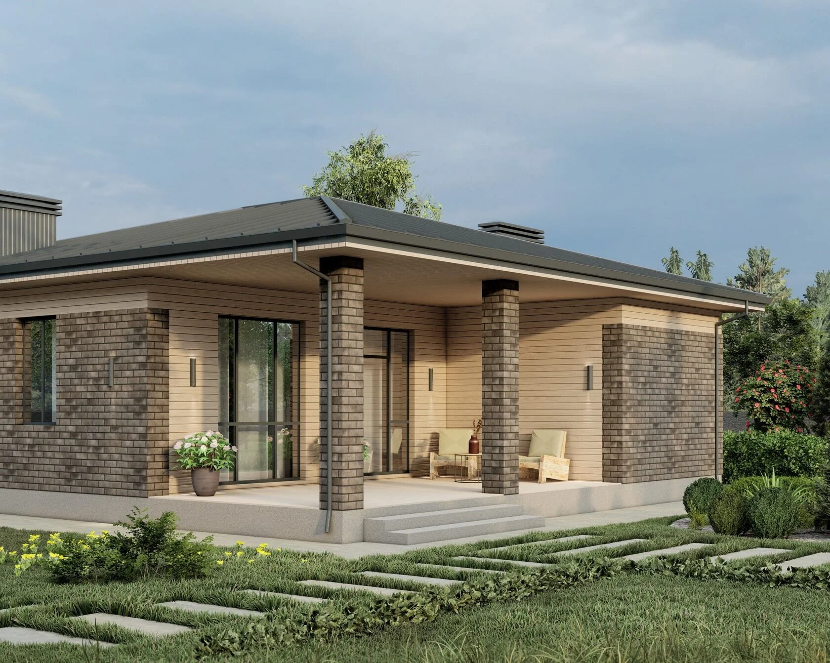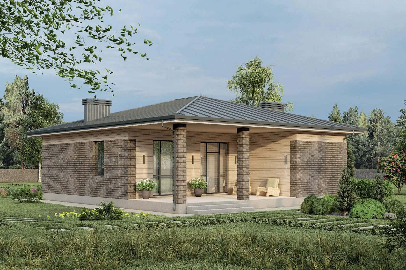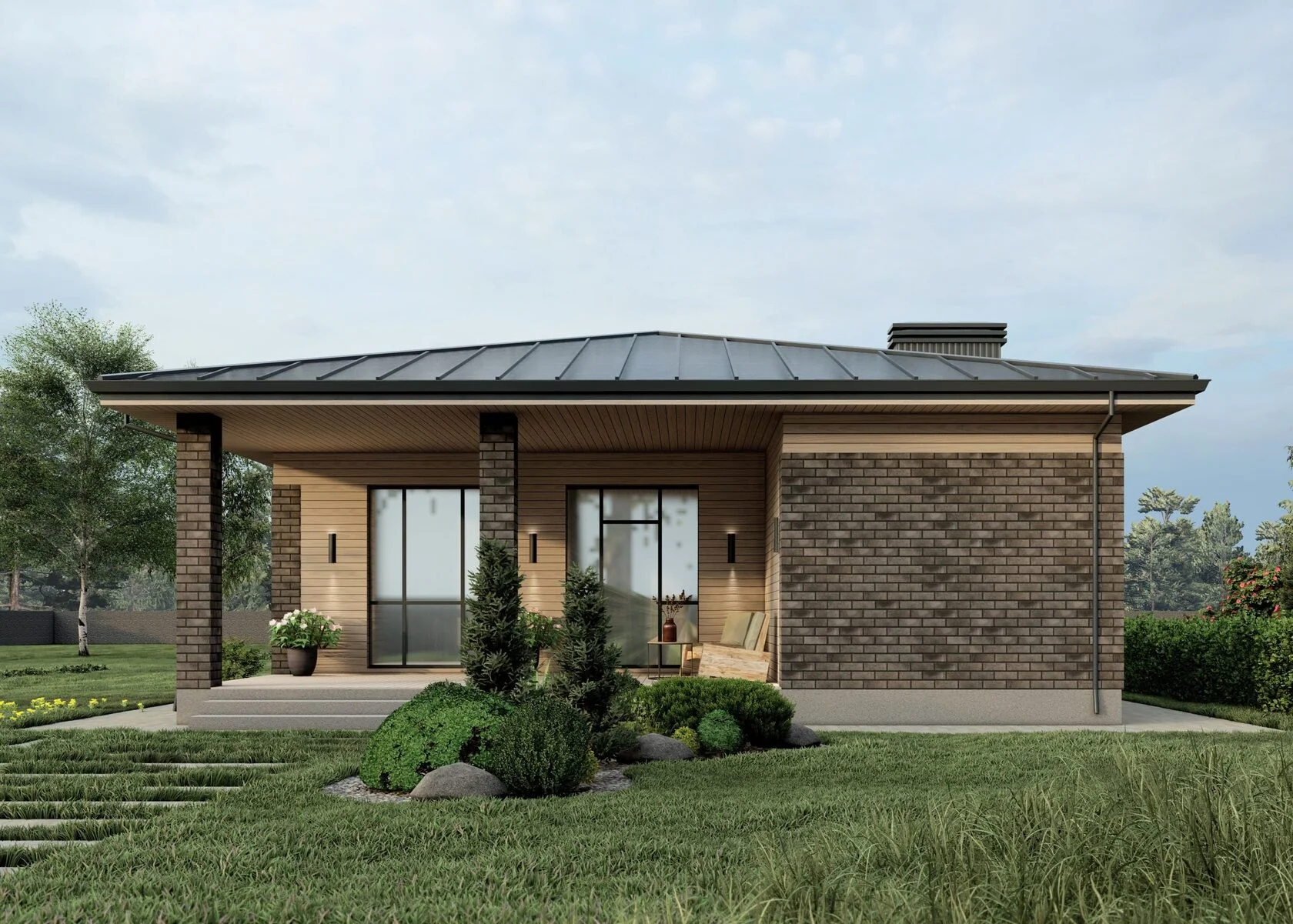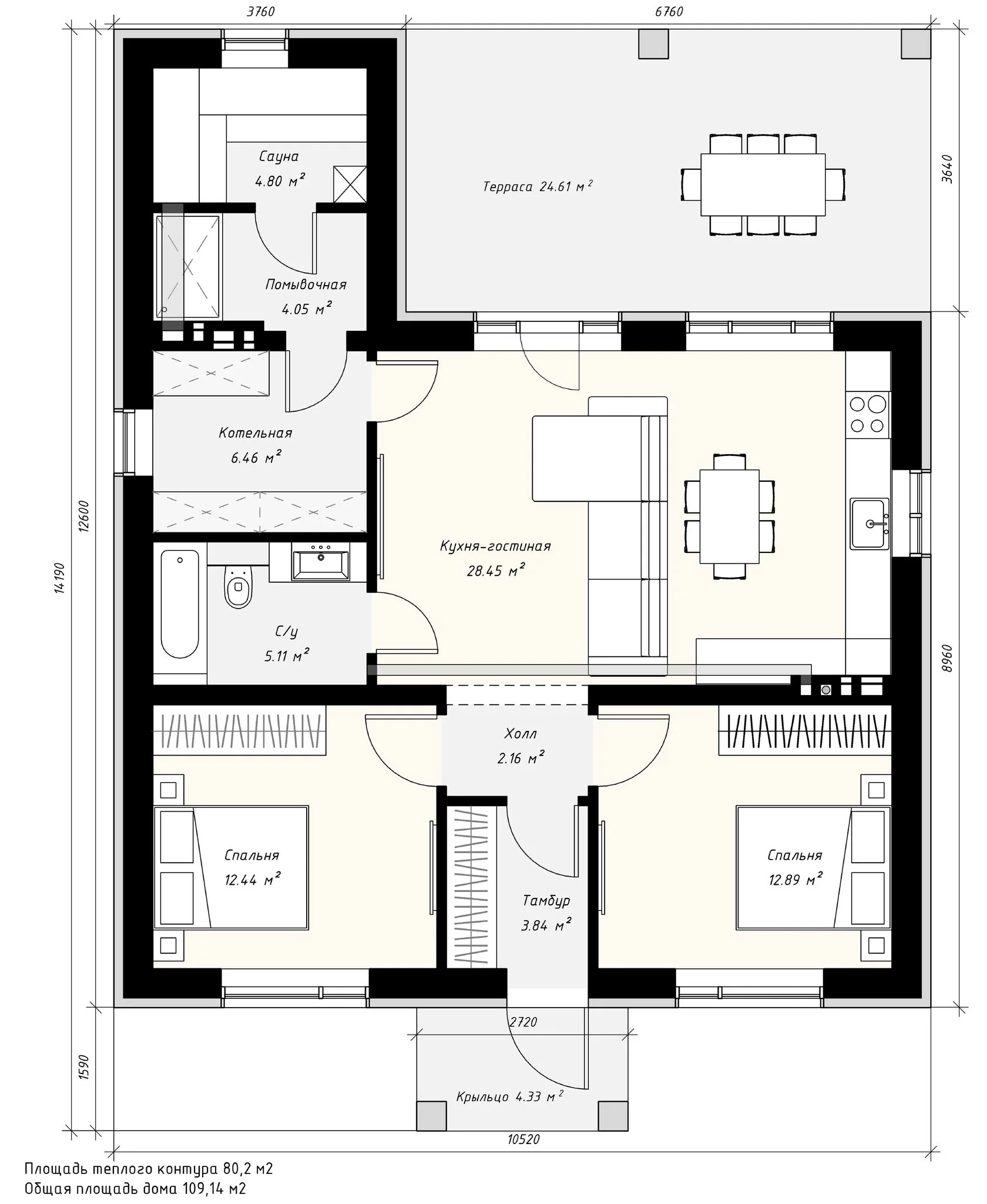 В вариантах указана стоимость строительства дома из разного материала. Цены указаны за строительство дома в ипотеку, при заказе строительства дома за наличный расчет предоставляется скидка 10%. Терраса 24,61 м², кухня-гостиная 28,45 м², спальня 12,44 м², спальня 12,89 м², тамбур 3,84 м², холл 2,16 м², с/у 5,11 м², котельная 6,46 м², помывочная 4,05 м², стулка 4,80 м², площадь теплого контура 80,2 м², общая площадь дома 109,14 м².