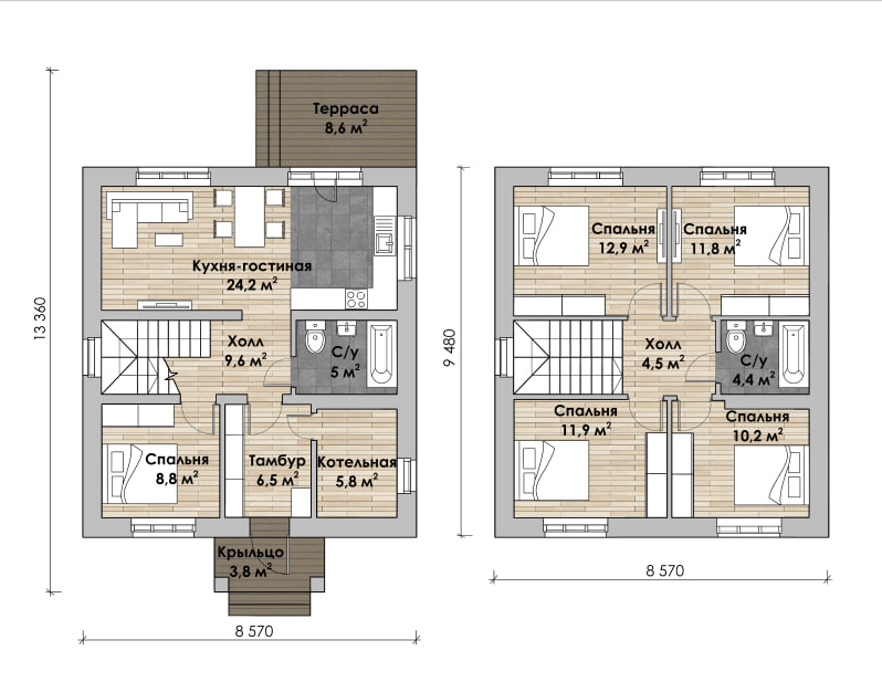 В вариантах указана стоимость строительства дома из разного материала. Цены указаны за строительство дома в ипотеку, при заказе строительства дома за наличный расчет предоставляется скидка 10% . Просторный дом для большой семьи общей площадью 112,1 м²: четыре уютные спальни (12,9 + 11,8 + 10,2 + 8,8 м²) обеспечат личное пространство каждому члену семьи, светлая кухня-гостиная 24,2 м² станет сердцем дома для семейных обедов и вечеров, два холла (9,6 м² и 4,5 м²), терраса 8,6 м² для летнего отдыха, санузел 4,4 м², тамбур 6,5 м², котельная 5,8 м² и крыльцо 3,8 м² — продуманная планировка для комфортной жизни круглый год.