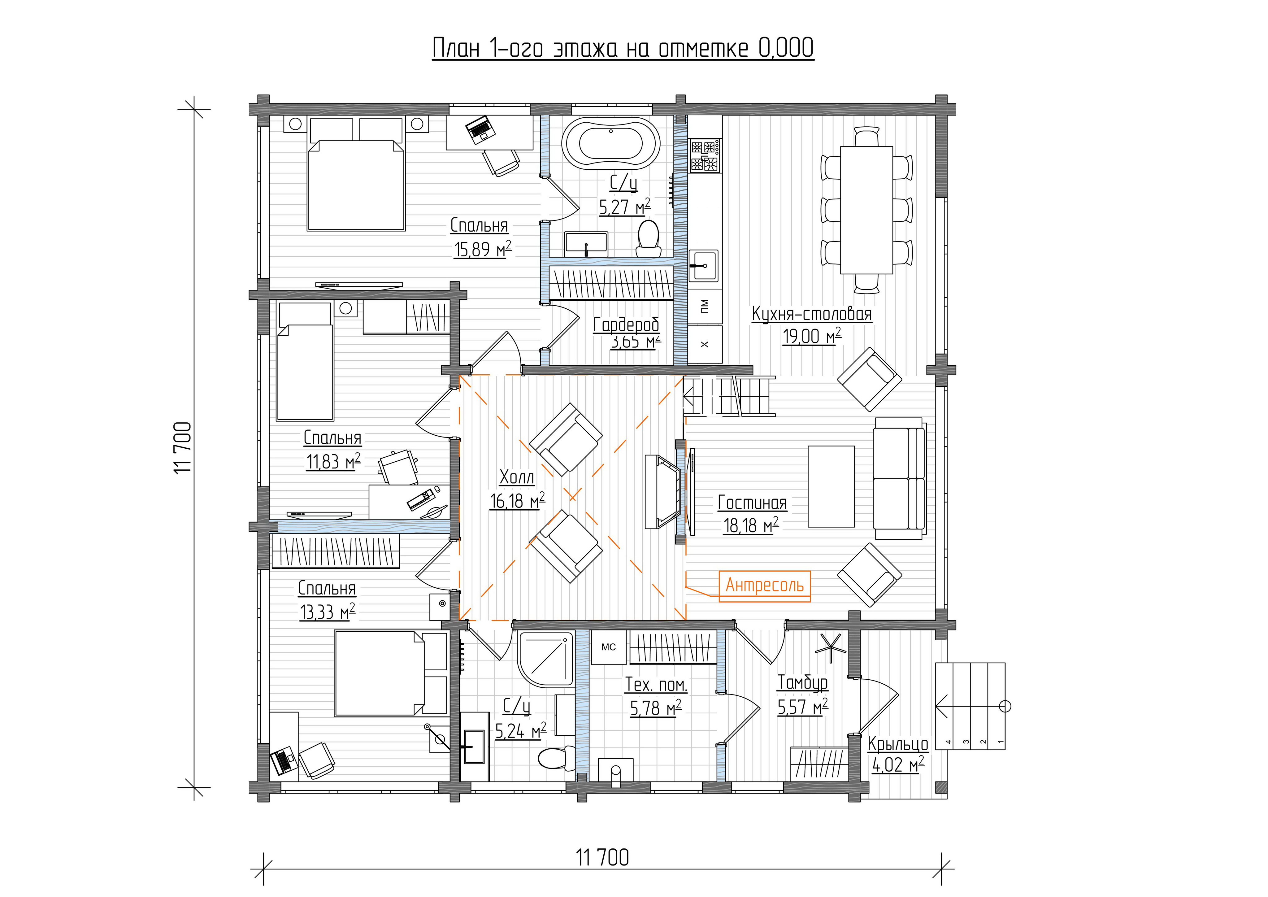 В вариантах указана стоимость строительства дома из разного материала. Цены указаны за строительство дома в ипотеку, при заказе строительства дома за наличный расчет предоставляется скидка 10%. С/у 5,27 м², Спальня 15,89 м², Гардероб 3,65 м², Кухня-столовая 19,00 м², Спальня 11,83 м², Холл 16,18 м², Гостиная 18,18 м², Антресоль, Спальня 13,33 м², МС, Тех. пом., С/у 5,24 м², Тамбур 5,57 м², Крыльцо 4,02 м². Общая отапливаемая площадь: примерно 113,94 м², общая с крыльцом и тамбуром: примерно 123,53 м².
