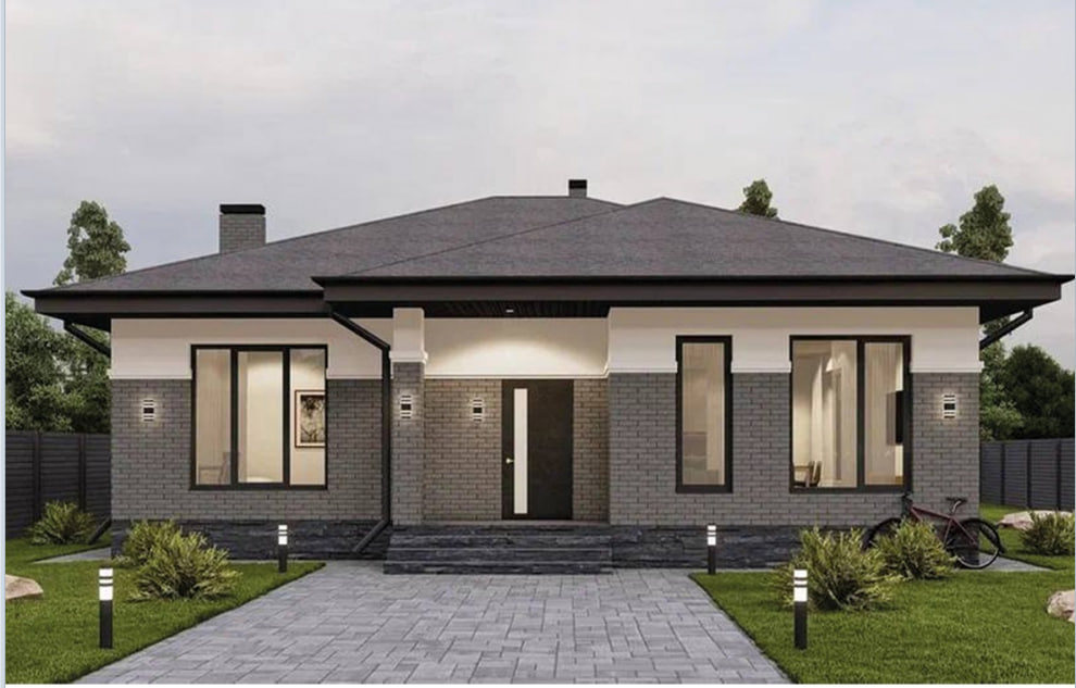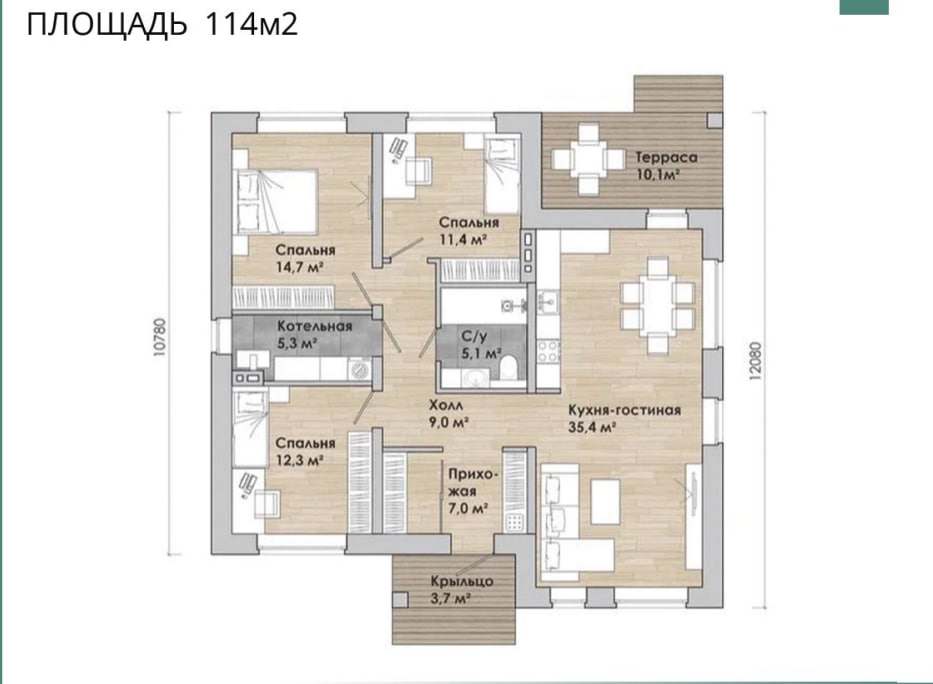 В вариантах указана стоимость строительства дома из разного материала. Цены указаны за строительство дома в ипотеку, при заказе строительства дома за наличный расчет предоставляется скидка 10%. .Крыльцо 3.7 м², прихожая 7.0 м², холл 9.0 м², кухня-гостиная 35.4 м², спальня 14.7 м², спальня 11.4 м², котельная 5.3 м², терраса 10.1 м². Общая площадь дома 114 м².