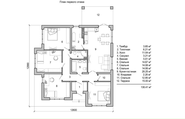 В вариантах указана стоимость строительства дома из разного материала. Цены указаны за строительство дома в ипотеку, при заказе строительства дома за наличный расчет предоставляется скидка 10%. .Ваш семейный дом мечты: утром вы завтракаете на террасе, днём дети играют в своей спальне, вечером вся семья собирается в большой кухне-гостиной, а уютные спальни дарят спокойный сон — четыре изолированные комнаты, два санузла, функциональная топочная и просторная кладовая делают этот дом по-настоящему готовым к жизни большой и дружной семьи.