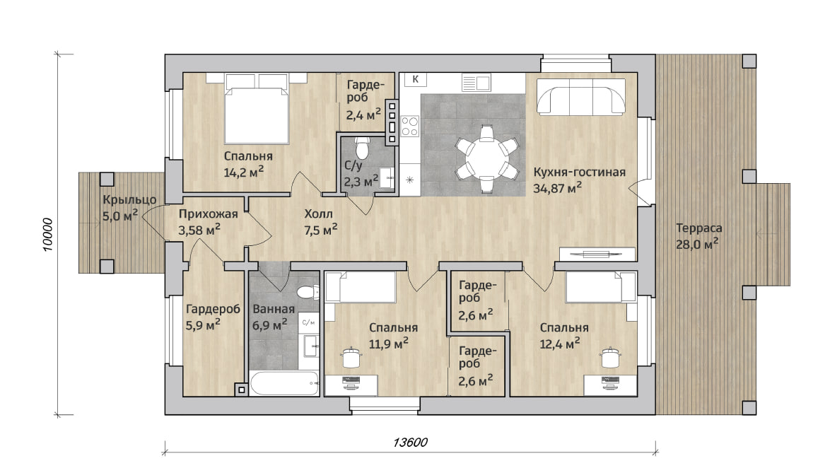 В вариантах указана стоимость строительства дома из разного материала. Цены указаны за строительство дома в ипотеку, при заказе строительства дома за наличный расчет предоставляется скидка 10%. Готовый проект дома 140,25 м² с продуманной планировкой: просторная кухня-гостиная 34,87 м² объединяет зону отдыха и приготовления пищи, огромная терраса 28,0 м² расширяет жилое пространство в тёплое время года, две спальни (14,2 и 12,4 м²), санузел 11,9 м², ванная 6,9 м², прихожая 3,58 м², холл 7,5 м², крыльцо 5,0 м² и пять гардеробных (5,9 + 2,4 + 2,3 + 2,6 + 2,6 м²) — идеальное решение для тех, кто ценит порядок и комфорт.