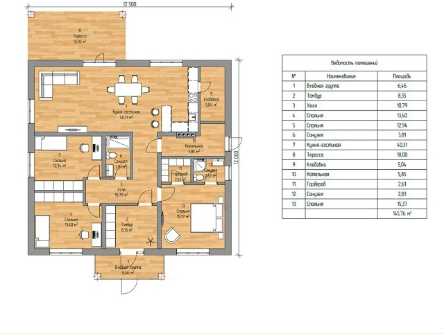 В вариантах указана стоимость строительства дома из разного материала. Цены указаны за строительство дома в ипотеку, при заказе строительства дома за наличный расчет предоставляется скидка 10%. Современный одноэтажный дом 145,7 м² — идеальная планировка для комфортной жизни семьи. Продуманный проект 12,5 × 12 м с просторной кухней-гостиной 40 м² и выходом на террасу 18 м². В доме 3 изолированные спальни, 2 санузла, гардеробная и котельная. Отдельная приватная зона для хозяев, удобный холл, тамбур и функциональные кладовые — всё рассчитано для реальной жизни без лишних метров.Дом компактный по габаритам, но максимально удобный внутри. Подойдёт для постоянного проживания семьи из 3–5 человек.