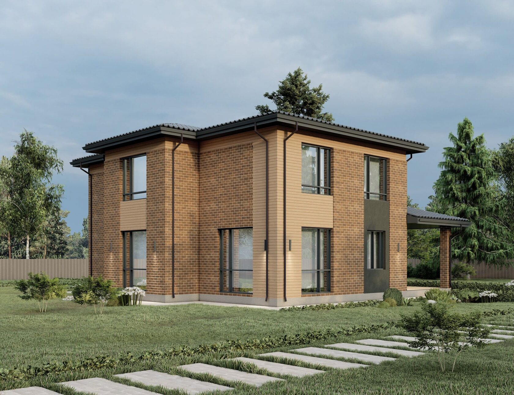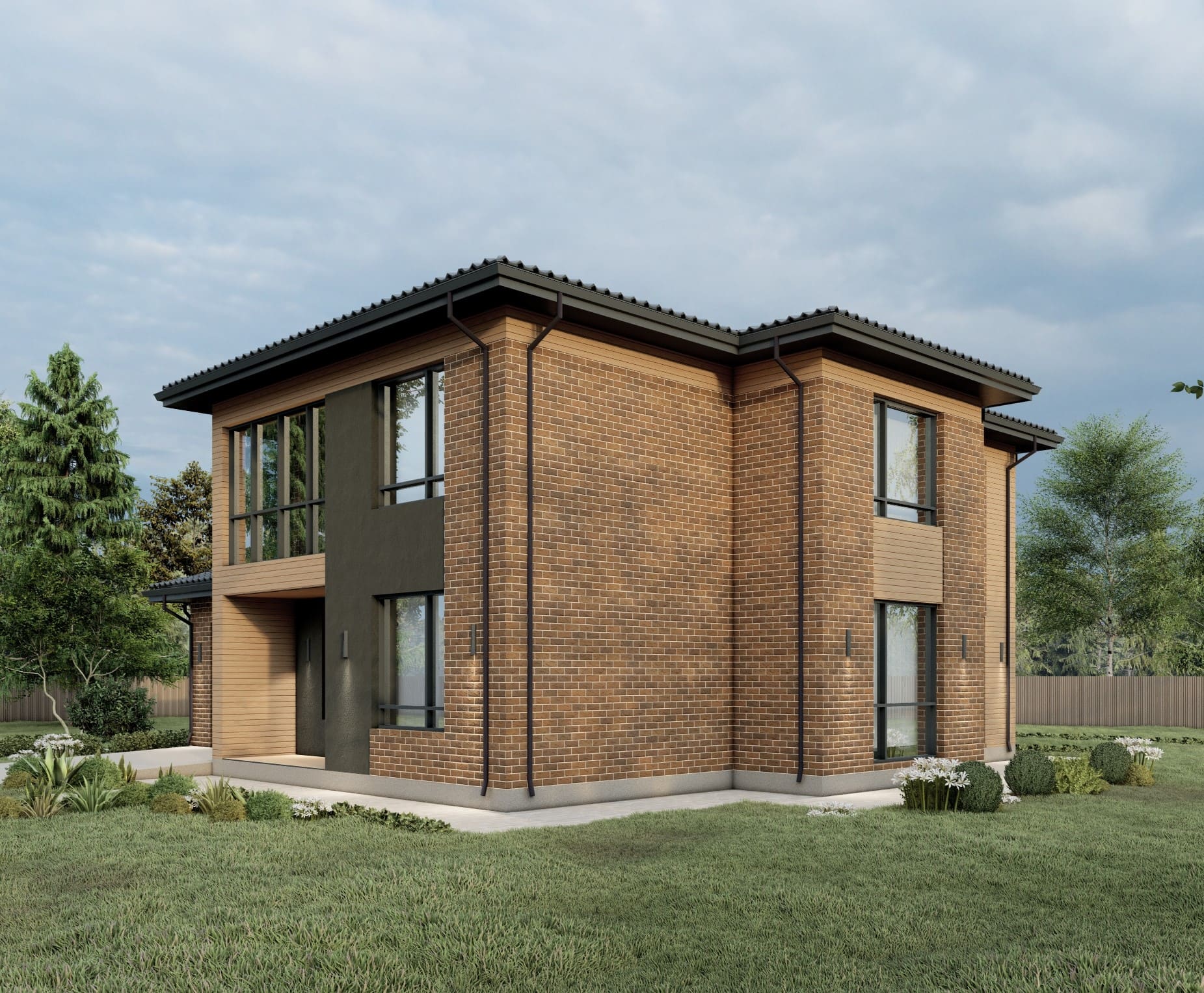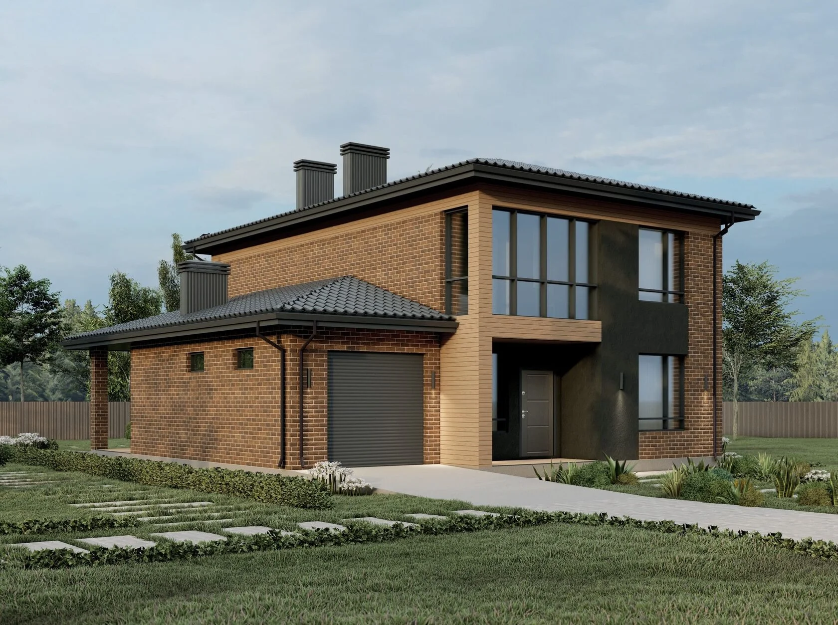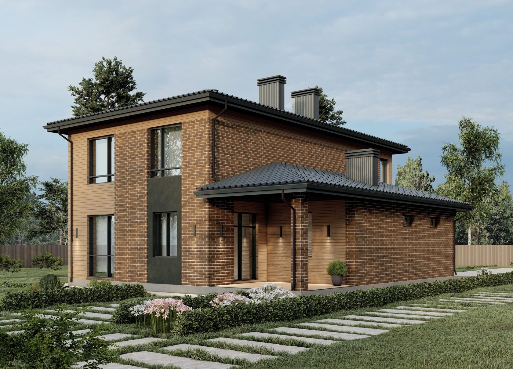 В вариантах указана стоимость строительства дома из разного материала. Цены указаны за строительство дома в ипотеку, при заказе строительства дома за наличный расчет предоставляется скидка 10%. Общая отапливаемая площадь дома — 215.98 м² (1 этаж: 111.88 м², 2 этаж: 79.61 м²). На первом этаже расположены: Кухня (14.16 м²), Гостиная-столовая (34.22 м²), Холл (12.09 м²), Тендер (6.20 м²), Столовая (15.11 м²), Крыльцо (5.91 м²), Терраса (10.63 м²), а также два помещения, обозначенные как Столы (11.33 м² и 14.68 м²).