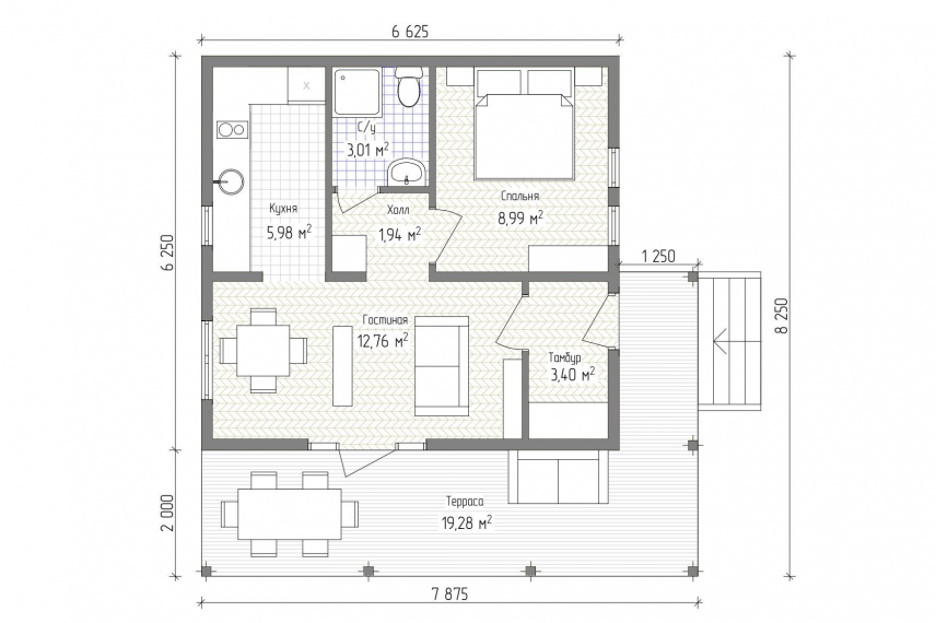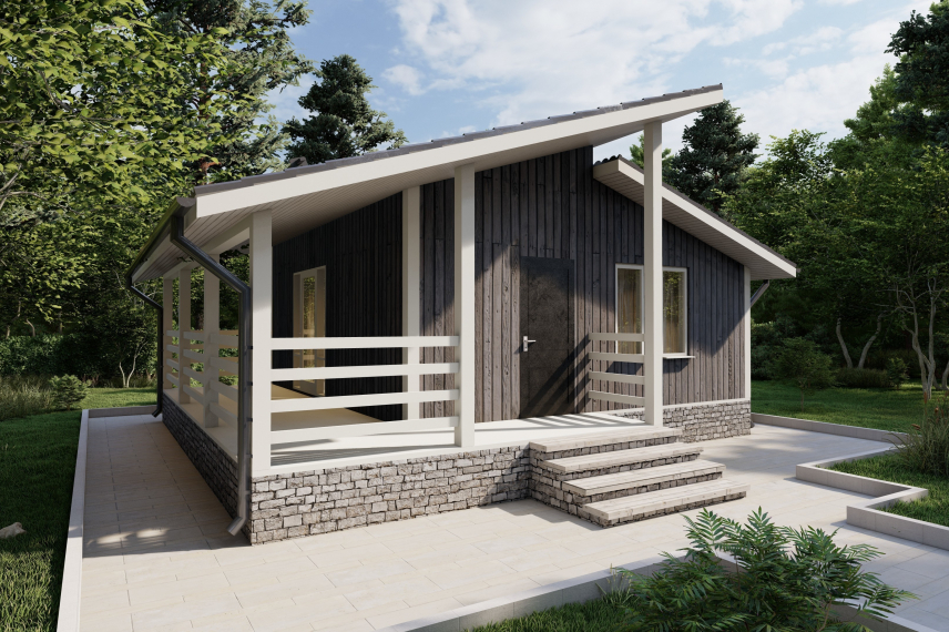 В вариантах указана стоимость строительства дома из разного материала. Цены указаны за строительство дома в ипотеку, при заказе строительства дома за наличный расчет предоставляется скидка 10%. Терраса имеет площадь 19,28 м2 и объединена с крыльцом. В дом два входа и оба с крыльца-террасы. Один в гостиную, а второй в тамбур. Гостиная имеет площадь 12,76 м2 и из нее можно попасть на кухню (5,98 м2) и в маленький холл (1,94 м2). Из холла есть входы в санузел и спальню площадью 8,99 м2. Это идеальный гостевой дом из СИП панелей для любителей спокойного отдыха на природе. Такой домик можно легко себе представить на опушке леса, на берегу озера или реки. Дом получается стильный и удобный, а просторная терраса позволяет проводить много времени под крышей, но на свежем воздухе.