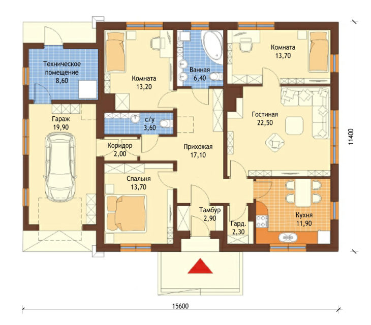 В вариантах указана стоимость строительства дома из разного материала. Цены указаны за строительство дома в ипотеку, при заказе строительства дома за наличный расчет предоставляется скидка 10%. техническое помещение — 8,60 м², гараж — 19,90 м², коридор — 2,00 м², спальня — 13,70 м², комната — 13,20 м², санузел — 3,60 м², ванная — 6,40 м², прихожая — 17,10 м², тамбур — 2,90 м², гардеробная — 2,30 м², ещё одна комната — 13,70 м², гостиная — 22,50 м², кухня — 11,90 м².