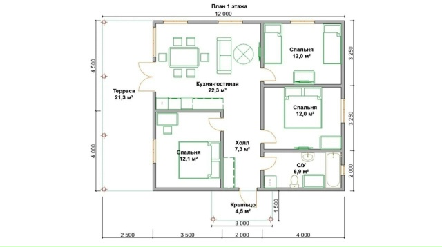 В вариантах указана стоимость строительства дома из разного материала. Цены указаны за строительство дома в ипотеку, при заказе строительства дома за наличный расчет предоставляется скидка 10%. .Продуманный проект общей площадью 86,3 м²: функциональное зонирование без лишних коридоров — просторная кухня-гостиная 22,3 м² с выходом на террасу 21,3 м², две спальни (12,0 и 12,0 м²) в тихой зоне, компактный холл 7,3 м², вместительный с/у 6,9 м² и крыльцо 4,5 м² — всё необходимое для комфортной жизни на одной площади. Для более подробной информации обратитесь в личные сообщения .