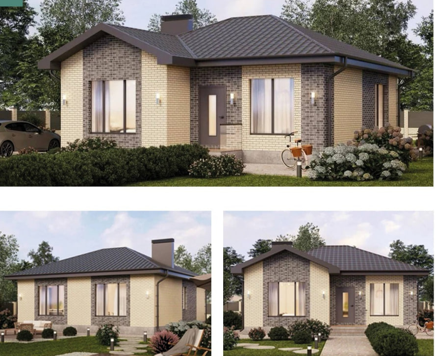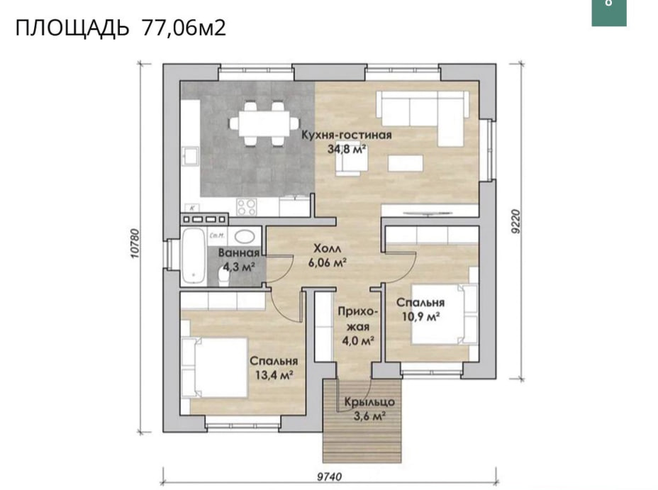 В вариантах указана стоимость строительства дома из разного материала. Цены указаны за строительство дома в ипотеку, при заказе строительства дома за наличный расчет предоставляется скидка 10%. Крыльцо 3.6 м², прихожая 4.0 м², холл 6.1 м², кухня-гостиная 34.8 м², спальня 13.4 м², спальня 10.9 м², ванная 4.3 м². Общая площадь дома 77.1 м².
