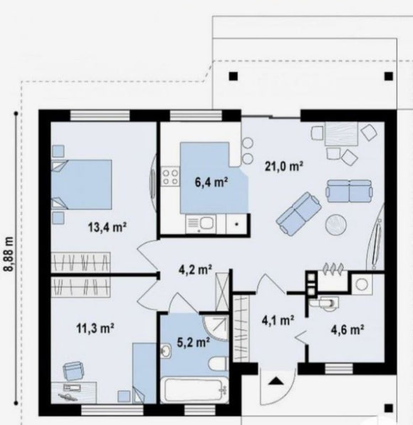 В вариантах указана стоимость строительства дома из разного материала. Цены указаны за строительство дома в ипотеку, при заказе строительства дома за наличный расчет предоставляется скидка 10%. Гостиная 21,0 м², кухня 13,4 м², спальня 11,3 м², спальня 8,88 м², санузел 6,4 м², санузел 5,2 м², коридор 4,6 м², кладовая 4,2 м², гардеробная 4,1 м². Общая площадь: примерно 78,68 м².