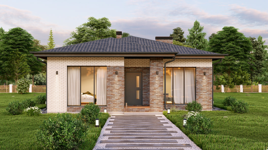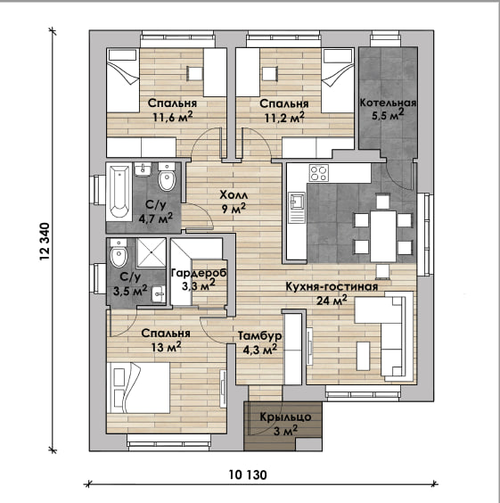 В вариантах указана стоимость строительства дома из разного материала. Цены указаны за строительство дома в ипотеку, при заказе строительства дома за наличный расчет предоставляется скидка 10% . Уютный дом для семьи общей площадью 84,9 м²: просторная кухня-гостиная 24 м² для семейных обедов и вечернего отдыха, три спальни (13 м² мастер-спальня + 11,6 м² + 11,2 м²), функциональная котельная 5,5 м², вместительный гардероб 3,3 м², светлый холл 9 м², тамбур 4,3 м² и крыльцо 3 м² — продуманное пространство для комфортной жизни без лишних метров.