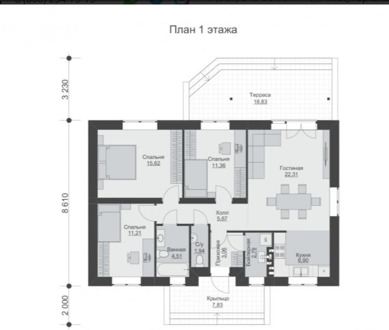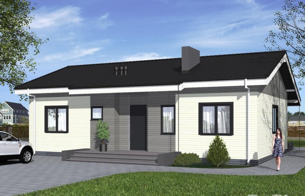 В вариантах указана стоимость строительства дома из разного материала. Цены указаны за строительство дома в ипотеку, при заказе строительства дома за наличный расчет предоставляется скидка 10%. Одноэтажный жилой дом с размерами здания 9,25 х 12,05 м. Наружная отделка здания – сайдинг. Фундамент – монолитная плита. Наружные стены – газобетонный блок. Внутренние стены – газобетонный блок. Перегородки – газобетонный блок. Пол первого этажа – по монолитной плите Крыша двускатная. Кровля – металлочерепица. Окна — металлопластиковые. Прихожая 3,06 м2, Бойлерная 2,79 м2, Кухня 6,90 м2, Гостиная 22,31 м2, Спальня 11,36 м2, Спальня 15,62 м2, Спальня 11,21 м2, Ванная 4,51 м2, С/у 1,94 м2, Холл 5,67 м2 .