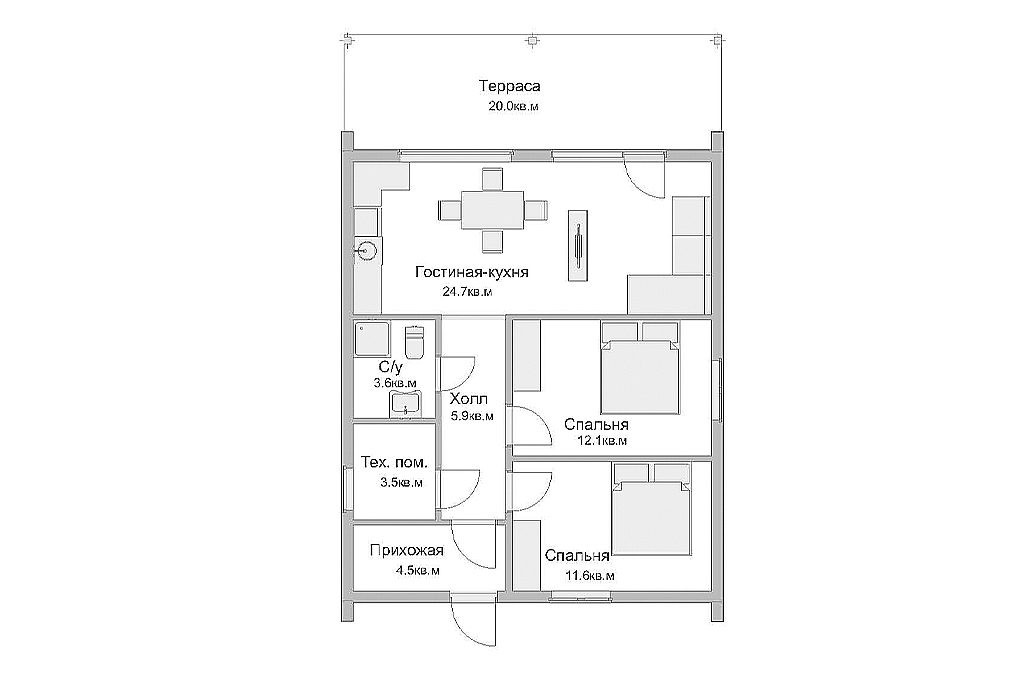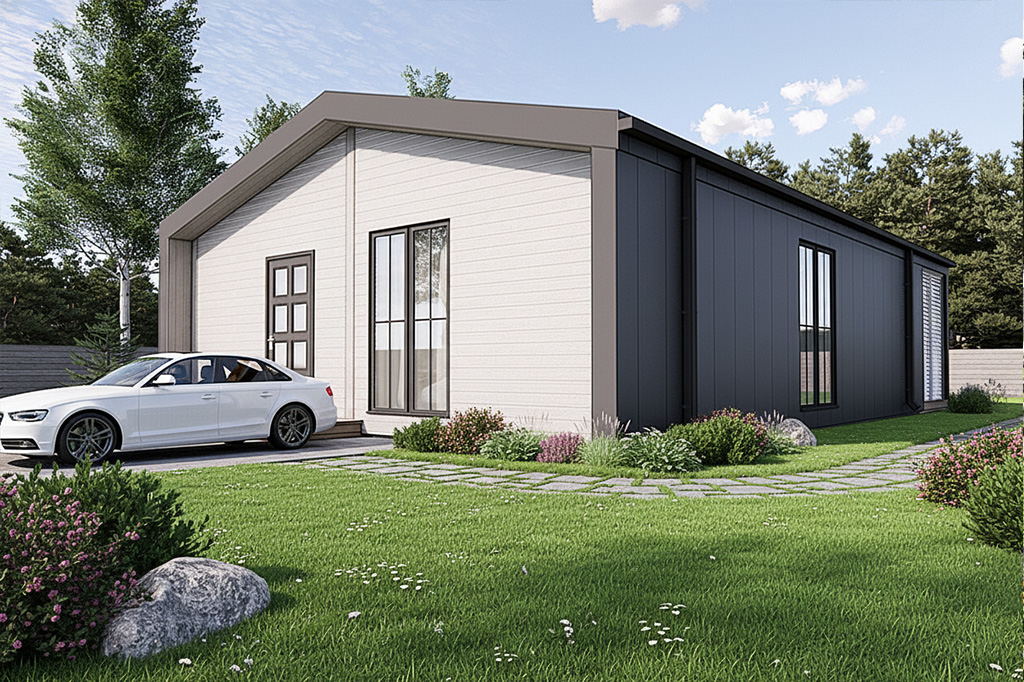 В вариантах указана стоимость строительства дома из разного материала. Цены указаны за строительство дома в ипотеку, при заказе строительства дома за наличный расчет предоставляется скидка 10%. Готовый проект современного одноэтажного каркасного дома в стиле барнхаус. Простые формы, двускатная крыша, крытая терраса. Относительно небольшая площадь дома способствуют значительной экономии средств во время строительства и эксплуатации. Фундамент дома – монолитная железобетонная плита. Стены – деревянный каркас. Полы этажа – стяжка с утеплением. Кровля металлическая фальцевая с полимерным покрытием.