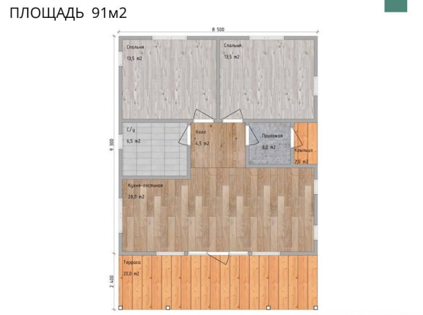 В вариантах указана стоимость строительства дома из разного материала. Цены указаны за строительство дома в ипотеку, при заказе строительства дома за наличный расчет предоставляется скидка 10%. Земля 2.0 м², пушкома 3.0 м², холл 4.5 м², кухня-декорация 28.0 м², теплосеть 20.0 м², склады 13.5 м², склады 13.5 м², санузел 6.5 м². Общая площадь дома 91 м².