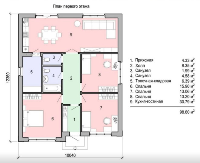 В вариантах указана стоимость строительства дома из разного материала. Цены указаны за строительство дома в ипотеку, при заказе строительства дома за наличный расчет предоставляется скидка 10%. Прихожая — 4,33 м², 2. Холл — 8,35 м², 3. Санузел — 1,99 м², 4. Санузел — 4,58 м², 5. Топочная-кладовая — 6,39 м², 6. Спальня — 15,90 м², 7. Спальня — 13,06 м², 8. Спальня — 13,20 м², 9. Кухня-гостиная — 30,79 м². Общая площадь: 98,60 м².