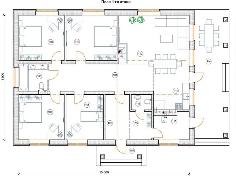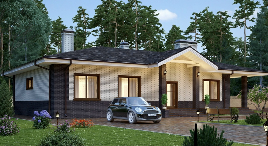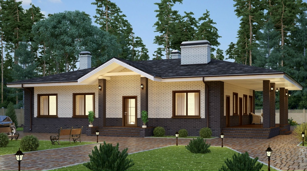 В вариантах указана стоимость строительства дома из разного материала. Цены указаны за строительство дома в ипотеку, при заказе строительства дома за наличный расчет предоставляется скидка 10%. Самый популярный проект дома. Этот загородный коттедж обладает элегантным дизайном, сочетающим в экстерьере контрастную отделку светлым и темным кирпичом и большие окна, что в целом придает строению очень уютный вид. Изюминкой проекта является большая крытая терраса, на которой хозяева могут обустроить летнюю столовую или место для комфортного послеобеденного отдыха. Жилая честь дома условно разделена на обеденную и спальную зоны. Первая, включает в себя просторный гостиный зал, соединенный с террасой и по-современному объединенный со столовой и кухней. Зал оборудован внутренним камином, который создает в помещении особую атмосферу домашнего очага, уюта и спокойствия. В спальной зоне, находящейся в левой половине коттеджа, архитекторы распланировали ванную комнату и четыре комфортабельные спальни, выходящие в общий холл, соединенный с прихожей. Благодаря удачной планировке, включающей, в том числе, и помещение автономной котельной, этот дом пригоден для всесезонной эксплуатации и круглогодичного проживания семьи из четырех – пяти человек.